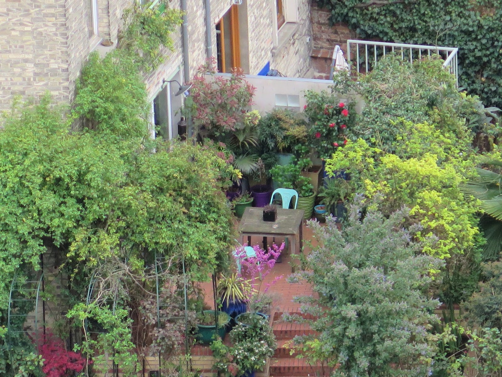 Il est bien joli ce petit jardin je vois des fleurs de couleurs rouges au fond,ce n'est pas un rosier peut-être un camélia mais un peu tard pour la saison!